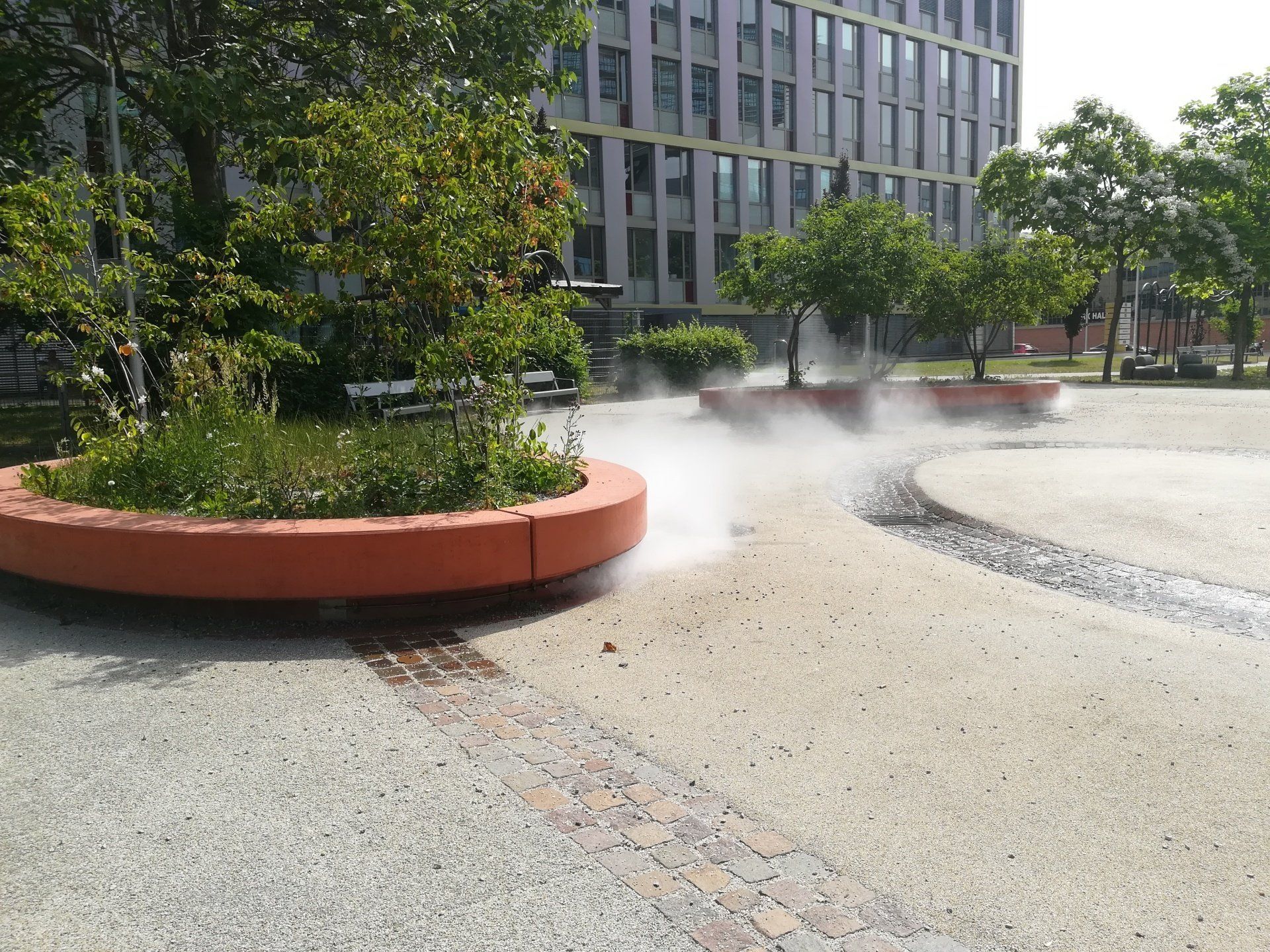 To achieve a finished evaporation process and hence best system performance of the system the number of nozzles and the air flowrate need to be adapted to the local climate. Typical applications are plaza, parks, playgrounds, courtyard as well as e.g. restaurant terraces in outdoor areas.