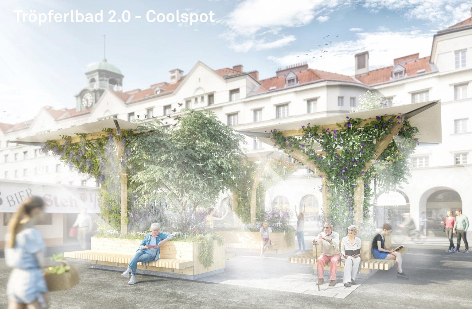 Cool Spots are one of the solutions to deal with the extreme heat in cities. Misting technology is highly efficient to cool urban spots, especially in combination with green zones and natural shadows. Recent European research projects AQUASAAL is are part of, show, that there are many creative ideas to integrate additional value for the population in such cooling zones.